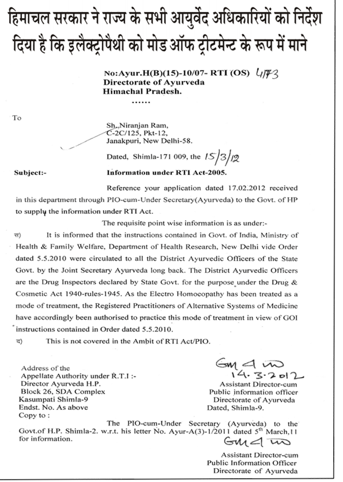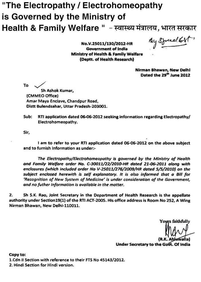 6 25-11-2003 Central Govt. of India, Ministry of Health & Family Welfare, and Department of Health -Research recognized the Electro homoeopathy.